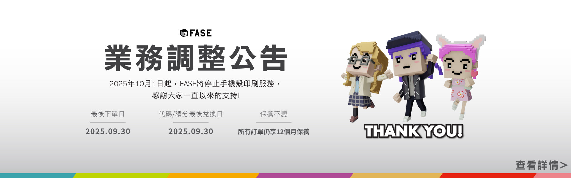 感謝您長期以來對FASE的信任與支持。經過審慎評估,FASE決定進行業務調整,將於2025年10月1日起全面停止提供手機保護殼印刷服務(下稱“業務終止日”)。以下為相關安排: ​