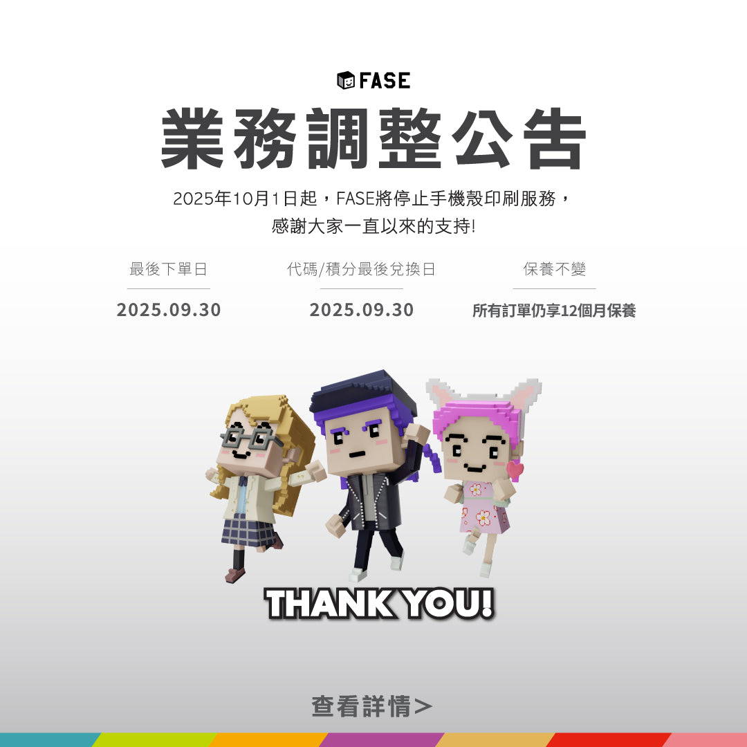 感謝您長期以來對FASE的信任與支持。經過審慎評估,FASE決定進行業務調整,將於2025年10月1日起全面停止提供手機保護殼印刷服務(下稱“業務終止日”)。以下為相關安排: